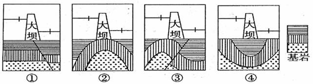 [解析]建设大坝要考虑地质构造,不能建在断层和地壳不稳定地带。背斜顶部受张力作用,易发生断裂,不宜建大坝;向斜槽部受挤压,岩层坚硬、地壳稳定,有利于建大坝。