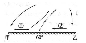 [解析]本题关键是选好“突破口” ,如从甲、乙两处入手,比较困难,只有从 60°处入手,仔细观察,该处有①、②两支气流相遇,①气流爬升在上。根据教材知识,60°附近中纬西风与极地东风相遇,中纬西风暖而轻,爬升到冷而重的极地东风上,由此可见①气流是中纬西风,②气流是极地东风。其他问题就迎刃而解了。