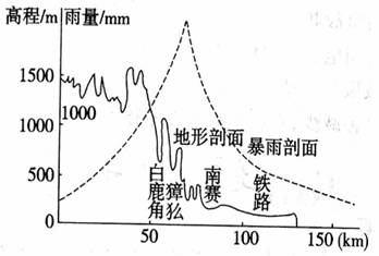 [解析]过降雨曲线最高点,作一条平行于纵轴的直线,找出该线与地形剖面线的交点,然后再据纵轴读出该点的高度即可。