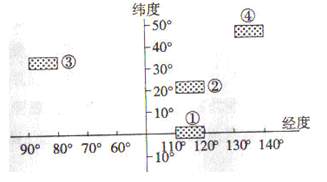 下图中的阴影部分表示四个地区在气候条件影响下,分布的四种农作物。根据图中提供的信息,完成24-25题。