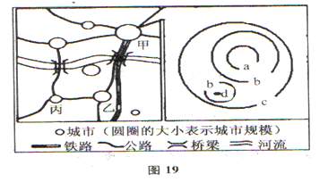 读某地区城市分布及甲城市地租等值线示意图(图19)完成33-34题。