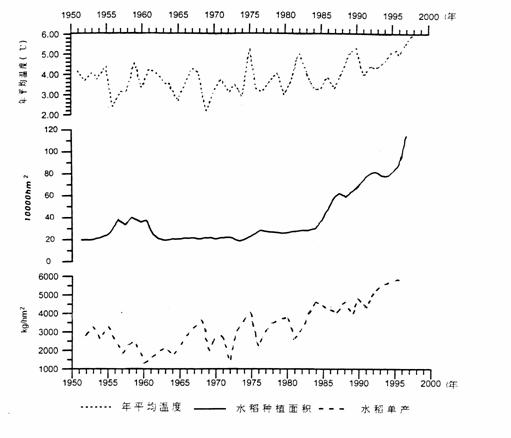 材料三:1950-1999年黑龙江省气温变化、水稻种植面积变化及其单产变化图