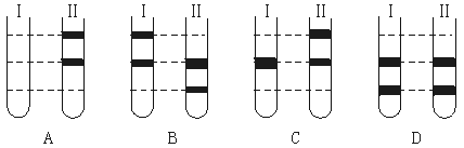 在氮源为14N的培养基上生长的大肠杆菌,其中DNA分子均为14N-DNA,在氮源为15N培养基上生长的大肠杆菌,其中DNA分子均为15N-DNA。若将 14N-DNA、15N-DNA以及14N、15N-DNA混在一起,用某种方法离心分离,其结果如上图所示。现将 15N-DNA转移到含14N的培养基上,再连续繁殖两代(Ⅰ和Ⅱ)后,将所得DNA采用同样的方法进行离心分离,则结果可用图下列哪一图表示