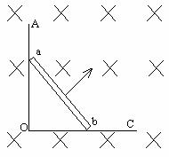 AOC是光滑直角金属导轨,AO沿竖直方向,OC水平方向。ab是一根金属直棒,如图立在导轨上,它从静止开始在重力作用下运动,运动过程中b端始终在OC上。整个装置放在一匀强磁场中,磁场方向垂直纸面向里,则ab棒在运动过程中( )