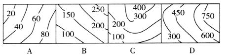 6.下面四幅等高线(单位:米)地形图中的等高距相同,水平比例尺不同,请判断坡度最缓的是 ( )