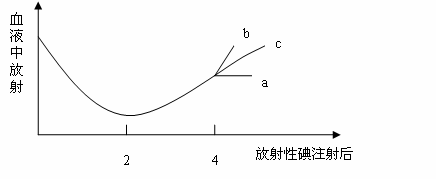 6.已知动物合成甲状腺激素需要碘,用体重、性别等均相同的三组实验用狗进行以下实验:将含有放射性碘的注射液注射到a、b、c三组狗的体内,然后定时检测狗体内血液中的放射量。4天后,向a组狗体内注射无放射性的甲状腺激素,向b组狗体内注射无放射性的促甲状腺激素,向c组狗体内注射生理盐水。实验结果如下图所示,对 实验结果描述错误的是
