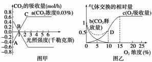 (3)乙图表示该植物的非绿色器官在不同氧浓度时,CO2释放量和O2吸收量的变化。当氧浓度为 时,无氧呼吸最弱;当氧浓度为b时,无氧呼吸消耗的葡萄糖是有氧呼吸的 倍。