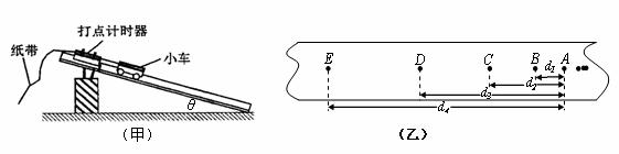 15. (8分)用图(甲)所示的装置利用打点计时器进行探究动能定理的实验,实验时测得小车的质量为 m,木板的倾角为 θ.实验过程中,选出一条比较清晰的纸带,用直尺测得各点与A点间的距离如图(乙)所示: AB=d1;AC=d2;AD=d3;AE=d4.已知打点计时器打点的周期为 T,重力加速度为 g ,小车与斜面间摩擦可忽略不计. 那么打 D 点时小车的瞬时速度为 ;取纸带上的BD段进行研究合外力做的功为 ,小车动能的改变量为