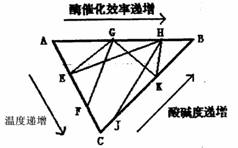 35.下图为酶催化反应效率关系图,A→B代表酶催化效率坐标:0到100%,A→C代表温度坐标:0到70℃,C→B代表溶液酸碱度坐标:PH=0.1到PH=14的范围,分析合理的是 ( )