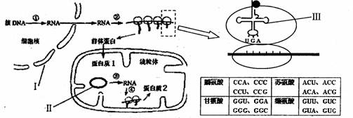 (4)根据右上表格判断:[Ⅲ] 。携带的氨基酸是 。若蛋白质2在线粒体内膜上发挥作用,推测其功能可能是参与有氧呼吸的第 阶段。