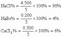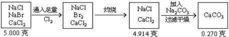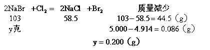 3、将5.000gNaCl、NaBr、CaCl2的混合物溶于水,通入氯气充分反应,然后把溶液蒸干并灼烧,得残留物4.914g。灼烧后的残留物再溶于水,并加足量的Na2CO3溶液,所得沉淀经干燥后质量为0.270g。求混合物中各化合物的质量百分组成。