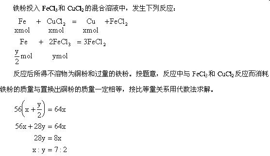 5、把过量的Fe粉投入到FeCl3和CuCl2组成的混合溶液中,充分搅拌,反应后过滤、干燥,称得不溶性物质的质量与加入铁粉的质量相等。求混合物中FeCl3和CuCl2的物质的量之比是多少?