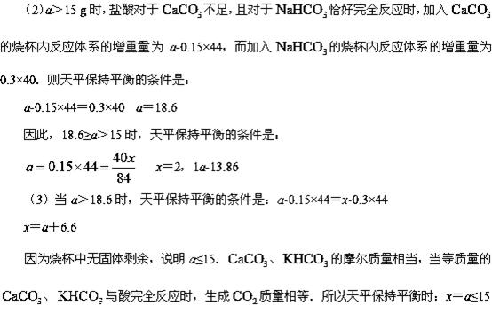 解析:这是一道天平平衡问题的计算.两个烧杯的质量相等.两个烧杯里盐酸溶液的质量相等.因此论证天平两个烧杯内反应体系质量改变量相等是解决本题的关键.由题意可知: