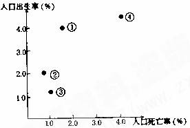 右图反映四个国家的人口出生率和死亡率,读图回答1-2题。