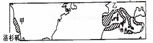32.下图阴影部分表示某种气候类型的分布,读图回答问题。(10分)