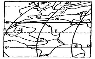 26.图中三条28℃等温线将图示地区划分为甲、乙、丙、丁四个区域,其中温度相对较低的区域是 ( )
