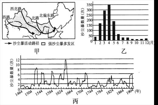 41、沙尘暴是指强风从地面卷起大量沙尘,使大气水平能见度小于1千米的特殊天气现象。图甲示意我国沙尘暴主要活动路径和强沙尘暴多发区;图乙、图丙依次表示1464----1913年华北地区沙尘暴按月份累计次数和逐年统计次数。分析图甲、乙、丙,回答下列问题。(12分)
