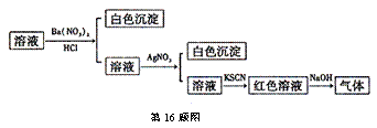 16.某同学为监察溶液中是否含有常见的四种离子,进行了下图所示的实验操作。其中检验过程中产生的气体能使红色石蕊试纸变蓝。由该实验能得到的正确结论是 ( )![]()