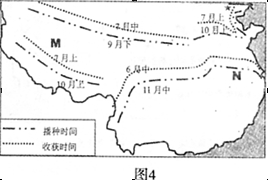 下图(图4)为我国某种主要农作物不同省份的农时图,其中时间为该农作物最迟的播种和收获时间。回答: