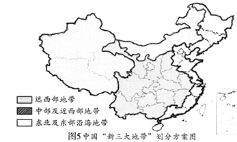 随着区域经济社会的快速发展,中国现行东、中、西三大地带已经难以适应新形式的要求,有学者提出中国宏观区域经济的“新三大地带”的划分方案,分为东北及东部沿海地带、中部及近西部地带、远西部地带(如图5)。完成下列问题。