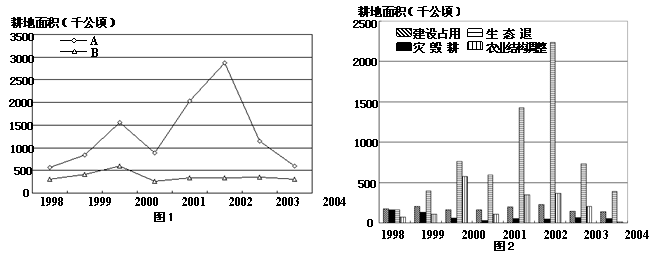 (1)图1中曲线B表示1998-2005年我国耕地面积年内________的曲线。请指出这条曲线变化的特点并分析原因。(8分)