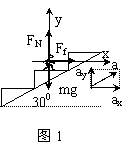 分析与解:对人受力分析,他受到重力mg、支持力FN和摩擦力Ff作用,如图1所示.取水平向右为x轴正向,竖直向上为y轴正向,此时只需分解加速度,据牛顿第二定律可得:
