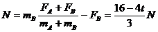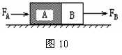 例8、如图10,在光滑水平面上放着紧靠在一起的AB两物体,B的质量是A的2倍,B受到向右的恒力FB=2N,A受到的水平力FA=(9-2t)N,(t的单位是s)。从t=0开始计时,则: