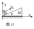 例12、如图17所示,水平粗糙的地面上放置一质量为M、倾角为θ的斜面体,斜面体表面也是粗糙的有一质量为m的小滑块以初速度V0由斜面底端滑上斜面上经过时间t到达某处速度为零,在小滑块上滑过程中斜面体保持不动。求此过程中水平地面对斜面体的摩擦力与支持力各为多大?