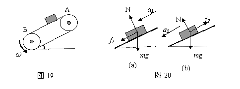 分析与解:物体放在传送带上后,开始阶段,传送带的速度大于物体的速度,传送带给物体一沿斜面向下的滑动摩擦力,物体由静止开始加速下滑,受力分析如图20(a)所示;当物体加速至与传送带速度相等时,由于μ<tanθ,物体在重力作用下将继续加速,此后物体的速度大于传送带的速度,传送带给物体沿传送带向上的滑动摩擦力,但合力沿传送带向下,物体继续加速下滑,受力分析如图20(b)所示。综上可知,滑动摩擦力的方向在获得共同速度的瞬间发生了“突变” 。