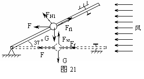 同理,分析杆与水平方向间夹角为370时小球的受力情况:重力G、支持力FN1、风力F、摩擦力Ff1,如图21所示。根据牛顿第二定律可得: