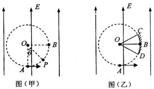13.(12分)如图(甲)所示,在场强大小为E、方向竖直向上的匀强电场中存在着一半径为R的圆形区域,O点为该圆形区域的圆心,A点是圆形区域的最低点,B点是圆形区域最右侧的点。在A点有放射源释放出初速度大小不同、方向均垂直于场强方向向右的正电荷,电荷的质量为m、电量为q,不计电荷重力、电荷之间的作用力。