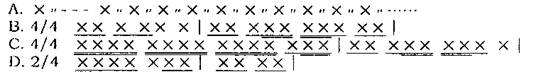 36.(2分)音乐作品的创作都来源于生活,山西绛州鼓乐《滚核桃》以其生动的鼓点节奏演绎了晾晒核桃的场景。下面节奏中表现倒核桃场景的是 ( )