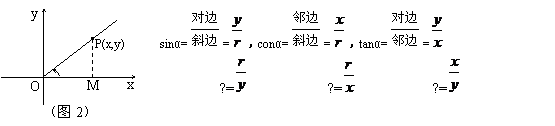 把锐角α安装(如何安装?角的顶点与原点重合,角的始边与x轴非负半轴重合)在直角坐标系中,在角α终边上任取一点P,作PM⊥x轴于M,构造一个RtΔOMP,则∠ MOP=α(锐角),设P(x,y)(x>0、y>0),α的临边OM =x、对边MP=y,斜边长|OP∣=r.