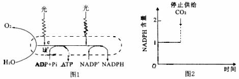 ②进行正常光合作用的叶片,如果在叶绿体的NAKPH与NADP+含量相等的情况下,突然停止供给CO2,请在图2中绘出叶绿体中NADPH含量的变化曲线。