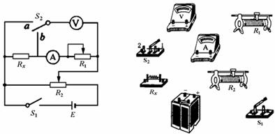 第一步:先将R2的滑动头调到最左端,单刀双掷开关S2合向a,然后闭合电键S1,调节滑动变阻器R1和R2,使电压表和电流表的示数尽量大些(不超过量程)