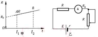 11. 如图甲是某金属材料制成的电阻R随摄氏温度t变化的图象,图中R0表示0℃时的电阻,k表示图线的斜率.若用该电阻与电池(电动势E、内阻r)、电流表A(内阻Rg)、滑动变阻器R′ 串联起来,连接成如图乙所示的电路,用该电阻做测温探头,把电流表的电流刻度改为相应的温度刻度,就得到了一个简单的“金属电阻温度计”.使用“金属电阻温度计”前,先要把电流表的刻度值改为相应的温度刻度值,若温度t1<t2,则t1的刻度应在t2的 侧(填“左”或“右”);在标识“金属电阻温度计”的温度刻度时,需要弄清所测温度和电流的对应关系.请用E、R0、k等物理量表示所测温度t与电流I的关系式t= 。
