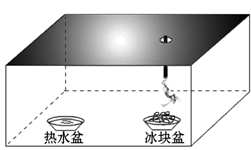某同学设计的地理实验,所需材料如下:顶层不封闭的长方形玻璃缸(长100cm、宽30cm、高40cm);塑料薄膜(在一侧开有一个小洞);一盆热水;一盆冰块;一支香;火柴。用以上材料可做一个地理事物运动过程的实验(如图),其步骤是:①把一盆热水和一盆冰块分别放入玻璃缸内的两侧; ②盖上塑料薄膜,有孔的一侧对着冰盆;③点燃香,朝下垂直从小孔插入约30cm。