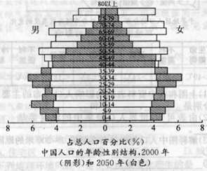 16、若①为落叶阔叶林带,则该山可能位于( ) A、山东半岛 B、欧洲西部 C、澳大利亚东南部 D、圭亚那高原 17、该山地北坡的垂直自然带完整且比南坡高的原因是( ) A、北坡的海陆热力性质差异显著,且地处迎风坡 B、北坡坡度比南坡小,地处阴坡和迎风坡 C、北坡海拔比南坡高,植被覆盖率比南坡高 D、北坡的相对高度大,地处阳坡和迎风坡,水分条件好 18、若CD一线的年降雪量等于消融量,B、C两点最大温差为28.80C,则该山地的海拔最接近( ) A、3700米 B、4800米 C、5000米 D、4680米 到2050年,我国60岁及以上老年人口将达4亿多,占那时中国总人口的1/4左右,占世界老年人口的1/5。老龄化现象极为严重。结合图回答19-20题。