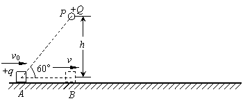 15.(15分)如图所示,在足够长的光滑绝缘水平直线轨道上方h高度的P点,固定电荷量为+Q的点电荷.一质量为m、电荷量为+q的物块(可视为质点),从轨道上的A点以初速度v0沿轨道向右运动,当运动到P点正下方B点时速度为v.已知点电荷产生的电场在A点的电势为φ(取无穷远处电势为零),PA连线与水平轨道的夹角为60°.试求: