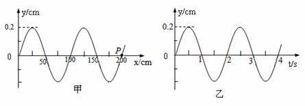 ⑵(4分)一列横波在x轴上传播,图甲为t=0时的波动图象,图乙为介质中质点P的振动图象.该波的波长为 ▲ m,频率为 ▲ Hz,波速为 ▲ m/s,传播方向为 ▲ .