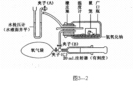 [例4]:(2003广东高考)某实验小鼠适宜生活在25℃左右的环境中,为探究低于适宜温度的环境(如lO℃)对小鼠能量代谢的影响(能量代谢的强弱用单位时间的耗氧量表示),请依据所给的实验装置(3---2)、实验材料和用品,在给出的实验方法和步骤的基础上,继续完成探究实验,预测可能的实验结果和结论,并回答问题。