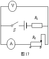 33.在图17所示的电路中,电源电压为6伏,且保持不变。当电键S闭合时R2的滑片在b端,电流表A的示数为0.1安,电压表V的示数为4伏。求: