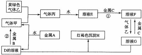 21.(8分)有三种金属单质A、B、C,其中单质A的焰色反应为黄色,B、C是常见金属。三种金属单质A、B、C能与气体甲、乙、丙及物质D、E、F、G、H之间发生如下转化关系(图中有些反应的产物和反应的条件没有全部标出)。