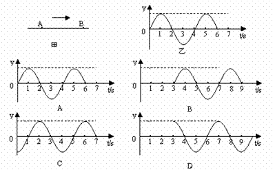 7、一列简谐横波以1m/s的速度沿绳子由A向B传播,质点A、B间的水平距离x=3m,如图甲所示.若t=0时 质点A刚从平衡位置开始向上振动,其振动图象如图乙所示,则B点的振动图象为下图中的( )