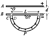 (16分)如图所示,A、B为两块平行金属板,A板带正电、B板带负电。两板之间存在着匀强电场,两板间距为d、电势差为U,在B板上开有两个间距为L的小孔。C、D为两块同心半圆形金属板,圆心都在贴近B板的O’处,C带正电、D带负电。两板间的距离很近,两板末端的中心线正对着B板上的小孔,两板间的电场强度可认为大小处处相等,方向都指向O’。半圆形金属板两端与B板的间隙可忽略不计。现从正对B板小孔紧靠A板的O处由静止释放一个质量为m、电量为q的带正电微粒(微粒的重力不计),问: