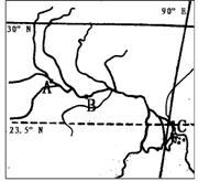 (1)图中A、B、C处,恒河流域洪涝灾害频次最多的河段是 。(2分)