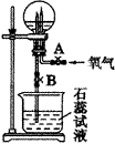 一只500mL圆底烧瓶,配上双孔橡皮塞,一孔插直玻璃管,直玻璃管下用胶管再连接一段直玻璃管,夹上止水夹B,并把直玻璃管插入盛有紫色石蕊试液的烧杯中;另一孔插直角导管,并用橡皮管和氧源相接,橡皮管上夹上止水夹A(见图5)。