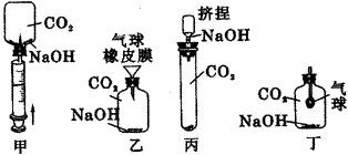 实验时,打开塞子,把固体氢氧化钠投入(100mL二氧化碳需氢氧化钠约1g)。投入后立即将附有针筒、橡皮膜的漏斗、塑料滴管、带气球的玻棒等的塞子塞上,然后摇动瓶子。可见:甲针筒的活塞逐渐推进,乙橡皮膜逐渐向内凹入,丙滴管胶头被大气压力压扁,丁瓶内的气球鼓起。