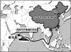 近年来,索马里海域海盗日益猖獗。中国海军护航编队于2008年12月26日从中国三亚启航,赴亚丁湾、索马里海域执行护航任务,读图回答10-11题。