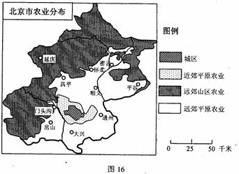 (3)北京不同地区的农业各具特色。远郊山区主要发展防护林,核桃、柿子、板栗、梨等经济林木,说明其主要意义。(2分)